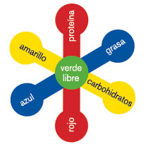 Para adelgazar puedes elegir un asterisco formado por una ración de alimento de color amarillo, una del rojo, una del azúl. ( carbohidratos, proteínas y grasas ).